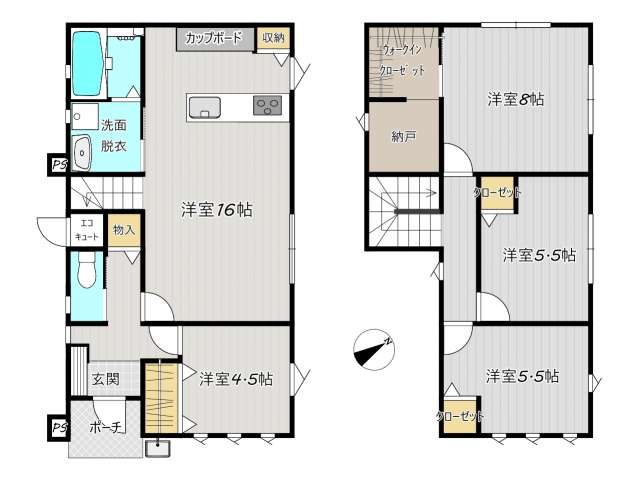 | 詳細間取 | 4LDK (2階:洋4.5帖×1、2階:洋5.5帖×2、2階:洋8帖×1、1階:LDK16帖) | ||